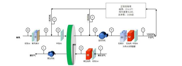 2)低濕需求空調(diào)房間,如正極輥壓間、正極分條間、正極模切間以及正極二分間等房間,其濕度控制需求為≤20%,以及正極涂布間、負(fù)極輥壓間、負(fù)極分條間、負(fù)極模切間以及負(fù)極二分間等房間,其濕度控制需求為≤45%,該需求通過(guò)冷卻除濕很難實(shí)現(xiàn),因此往往通過(guò)轉(zhuǎn)輪除濕機(jī)組處理后來(lái)滿(mǎn)足使用需求,機(jī)組中設(shè)置一級(jí)轉(zhuǎn)輪。
