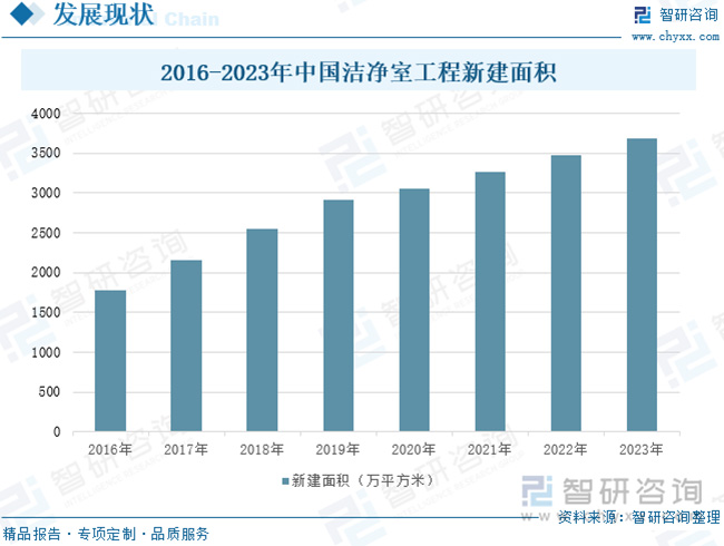 目前,全球半導(dǎo)體、光電等電子信息產(chǎn)業(yè)在世界范圍內(nèi)轉(zhuǎn)移,東亞、東南亞等地區(qū)已成為世界電子信息行業(yè)的主要市場和發(fā)展重心;同時(shí)由于我國醫(yī)藥衛(wèi)生、半導(dǎo)體、航空航天等事業(yè)的不斷發(fā)展,加速推動了潔凈室的市場化需求,從而帶動我國潔凈室工程產(chǎn)業(yè)的快速發(fā)展。2023年,中國潔凈室工程新建面積達(dá)3689萬平方米,同比增長6.04%。