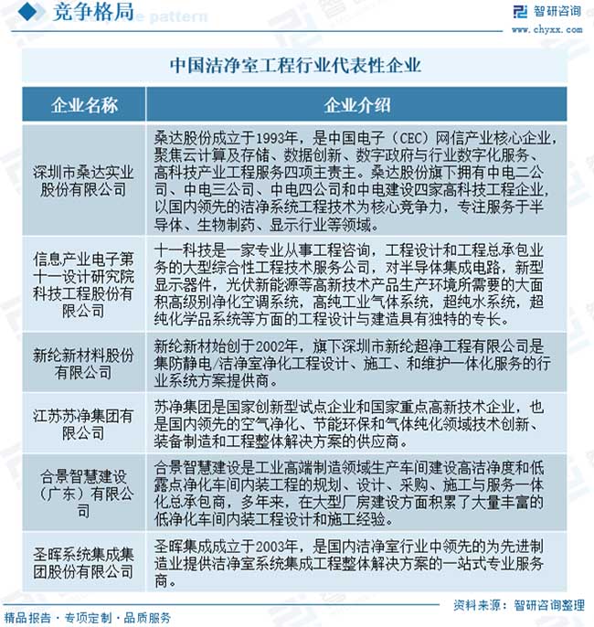 超潔凈環(huán)境控制又融合了風(fēng)險(xiǎn)評估、生產(chǎn)認(rèn)證的概念和程序,加之潔凈技術(shù)跨行業(yè)、跨專業(yè)、跨學(xué)科的特點(diǎn),使得潔凈室工程的難度和復(fù)雜性增加。因此對于潔凈室工程行業(yè)來說,優(yōu)化設(shè)計(jì)、現(xiàn)場施工環(huán)境的協(xié)調(diào)與管控、工程相關(guān)技術(shù)細(xì)節(jié)的經(jīng)驗(yàn)積累,對客戶需求的理解和實(shí)現(xiàn),以及對設(shè)計(jì)變更的準(zhǔn)備和響應(yīng)程度等都是衡量潔凈室工程企業(yè)競爭能力的重要指標(biāo)。?目前,我國潔凈室工程行業(yè)競爭較為激烈,企業(yè)數(shù)量較多。其中,桑達(dá)股份、十一科技、蘇凈集團(tuán)、新綸新材、柏誠股份、亞翔集成等設(shè)計(jì)研究院或建設(shè)承包企業(yè)在降低建造成本、提高潔凈室的穩(wěn)定性等方面占據(jù)優(yōu)勢,能提供高端潔凈室系統(tǒng)集成解決方案,位居行業(yè)領(lǐng)先地位。同時(shí),行業(yè)內(nèi)還存在大量規(guī)模較小、技術(shù)水平與綜合解決方案能力有限的潔凈室工程企業(yè),普遍集中在對潔凈等級要求不高的低端市場。
