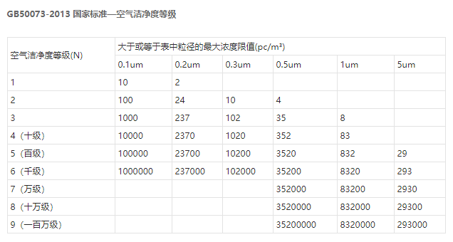 空氣潔凈度等級(jí)(air cleanliness class):潔凈空間單位體積空氣中,以大于或等于被考慮粒徑的粒子最大濃度限值進(jìn)行劃分的等級(jí)標(biāo)準(zhǔn)。國(guó)內(nèi)按空態(tài)、靜態(tài)、動(dòng)態(tài)對(duì)無(wú)塵車(chē)間進(jìn)行測(cè)試、驗(yàn)收,符合《GB50073-2013 潔凈廠(chǎng)房設(shè)計(jì)規(guī)范》、《GB50591-2010 潔凈室施工及驗(yàn)收規(guī)范》。
