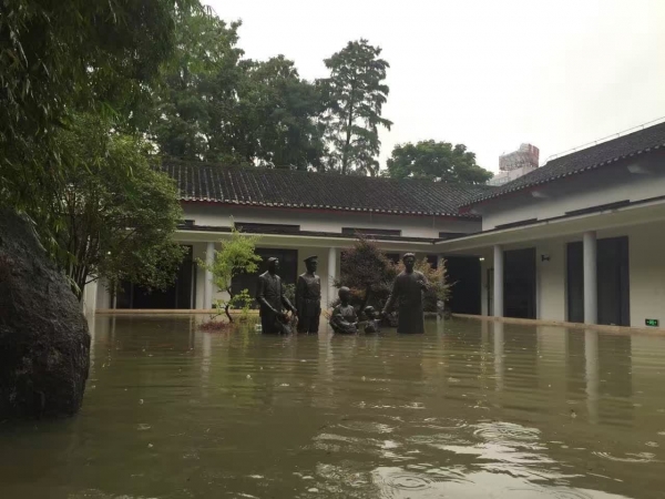 連日來,武漢境內普降暴雨,武漢革命博物館所在的都府堤街一直都是武昌區(qū)地勢較低的區(qū)域,逢大雨出現(xiàn)內澇的可能性極大。因此,館領導班子第一時間拿出了防洪應對具體措施,加強了夜間巡查,強化預警通報流程,時刻準備著嚴守全國重點文物保護單位的安全。 7月6日凌晨5點至8點半,盡管在有防備和安排的前提下,由于雨水來勢兇猛,且聚集時間很短,全國重點保護單位——武昌農講所舊址、毛澤東舊居、中共五大會址還是沒有抵擋住連續(xù)不斷持續(xù)的大水侵蝕,水勢快速漲至70—120厘米,水位長時間保持不退態(tài)勢,三處國保處于一片汪洋大海中,在館長和書記帶領下,因措施到位施救及時,武漢革命博物館避免了文物庫房和檔案資料室、圖書室等重要部位遭受更大的損失。